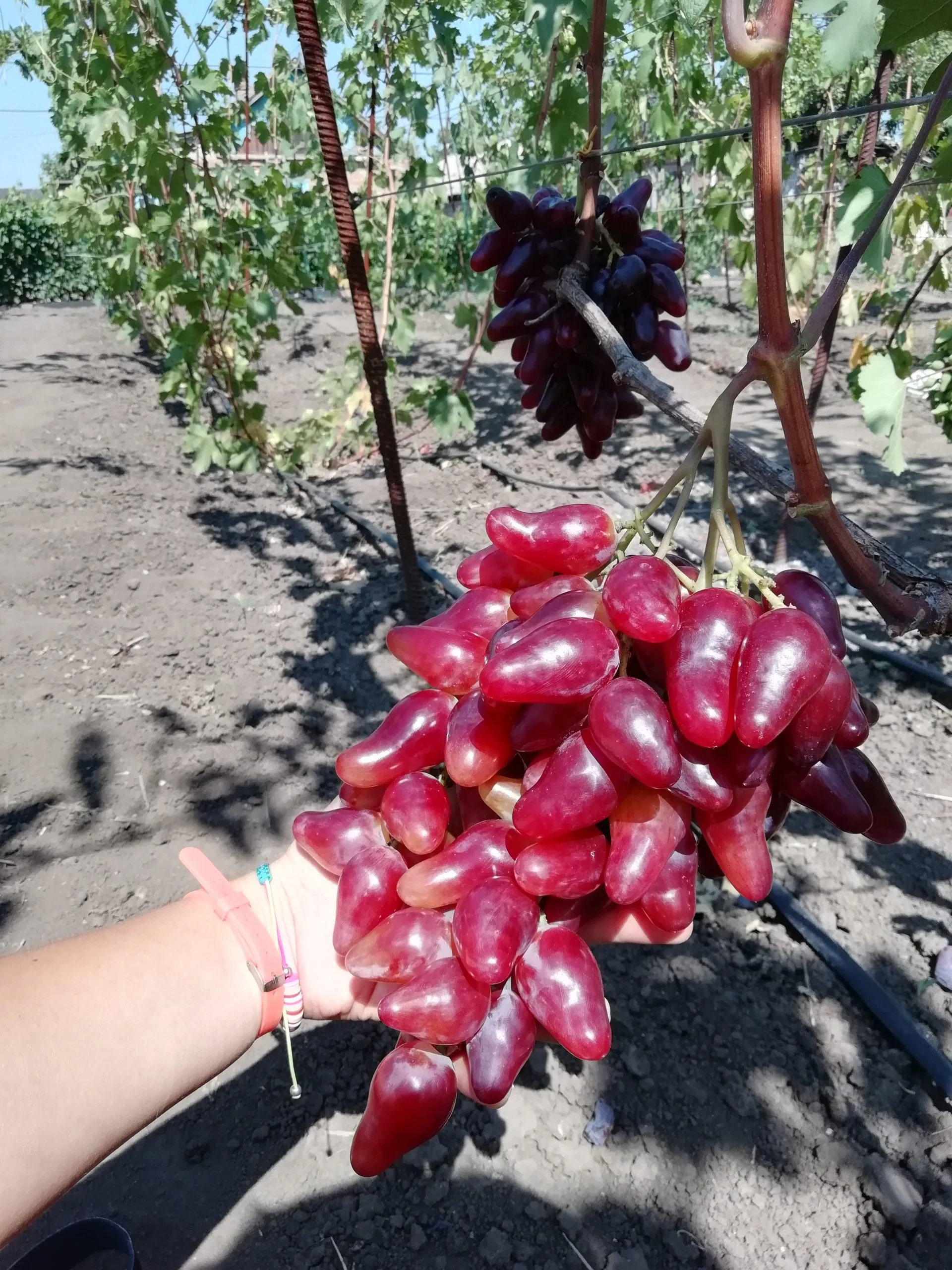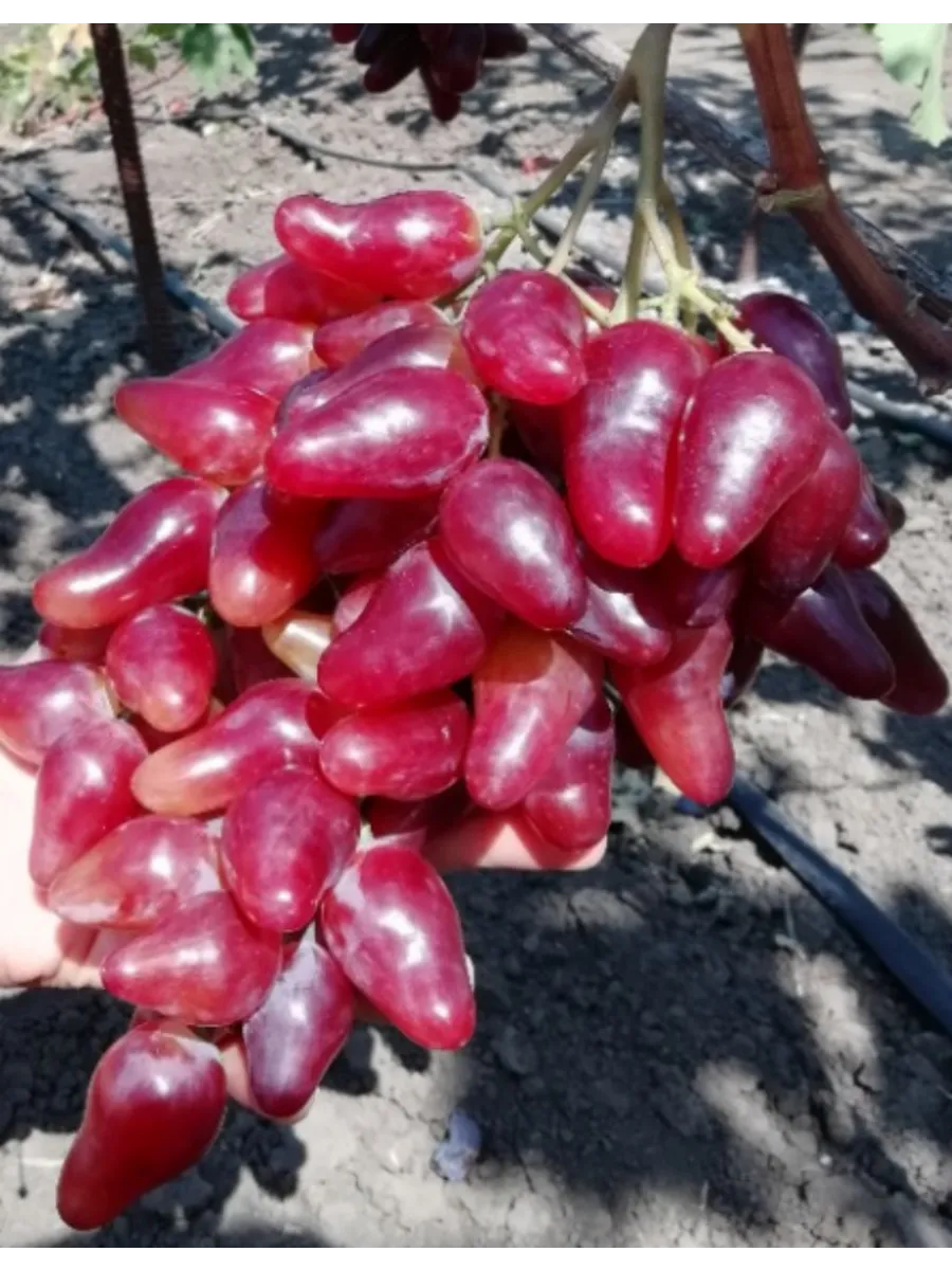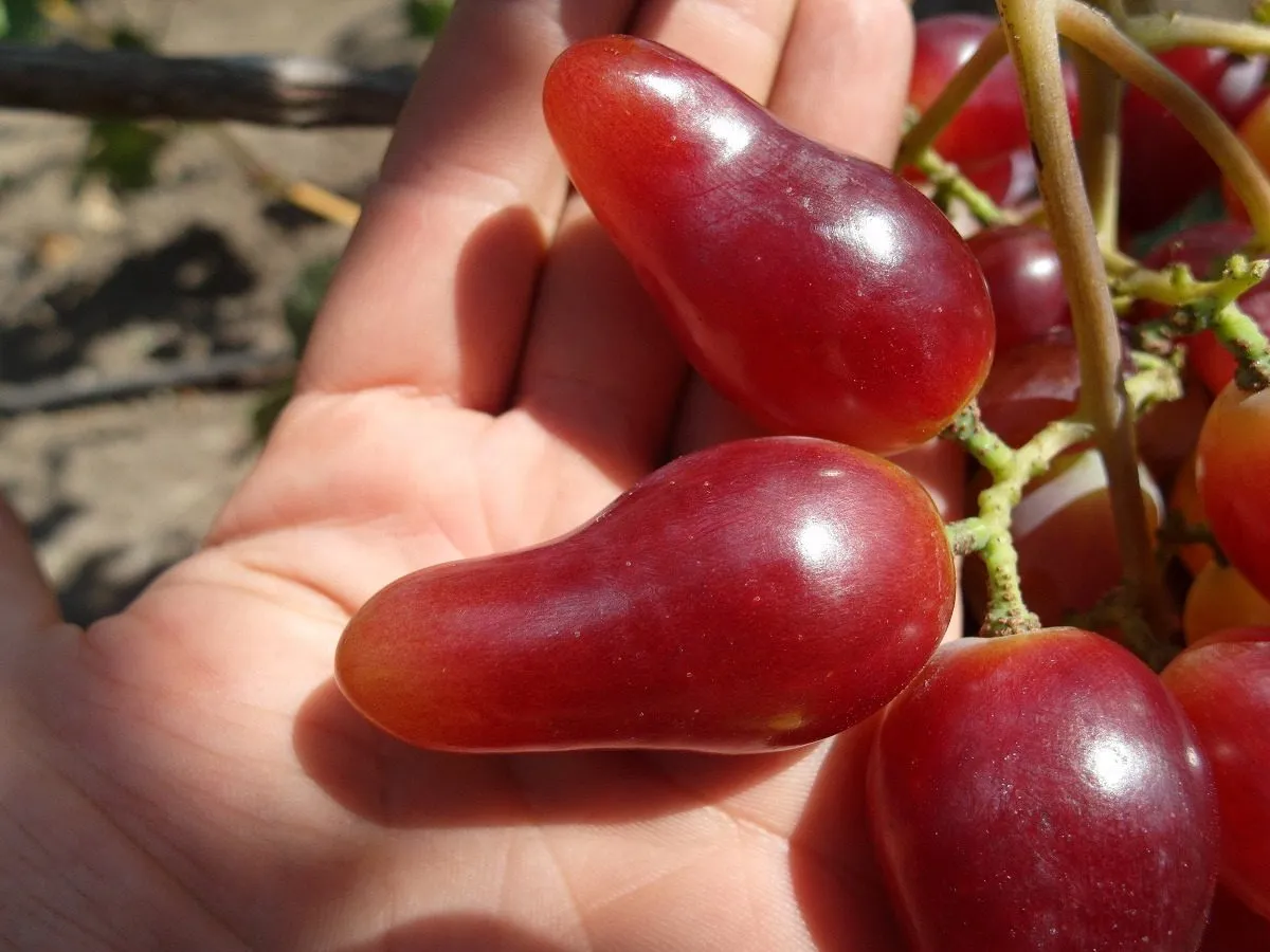 Внешний вид плодов является визитной карточкой сорта. Удлиненно-овальная, часто сосковидная форма с насыщенным малиновым окрасом делает грозди очень презентабельными. Ягода крупная, ее средний вес около 11 граммов, что подтверждается взвешиванием.