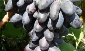 Ягоды — главная гордость сорта. Они имеют выраженную продолговатую форму и впечатляющий для столового винограда вес около 8 граммов каждая. Окрас соответствует описанию «виннокрасный» — это глубокий, теплый оттенок между розовым и красным, который неравномерно проявляется на ягоде, создавая красивый градиент, особенно на солнце.