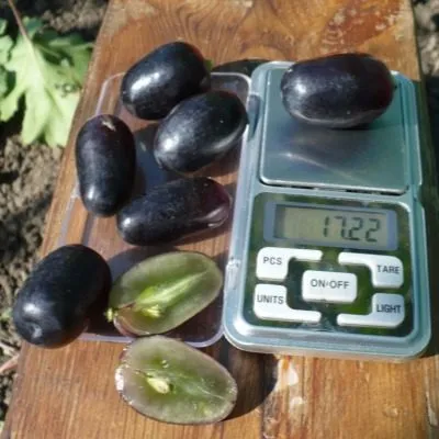Ягоды — главная гордость сорта. Они имеют выраженную продолговатую форму и впечатляющий для столового винограда вес около 8 граммов каждая. Окрас соответствует описанию «виннокрасный» — это глубокий, теплый оттенок между розовым и красным, который неравномерно проявляется на ягоде, создавая красивый градиент, особенно на солнце.