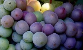 Ягоды имеют уникальную, «фирменную» окраску — розовато-серую, часто с сизым или пепельным восковым налетом. Их форма округлая, но неидеальная: часто наблюдается деформация или небольшой размер. Это сортовой признак, а не результат заболевания или плохого ухода. Тонкая кожица делает ягоды уязвимыми к механическим повреждениям и осам, что требует аккуратного обращения во время сбора урожая.