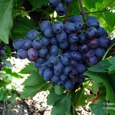 Сорт ценится за высокую урожайность и отличные товарные характеристики. Грозди умеренной плотности, средним весом около 500 граммов, хорошо переносят транспортировку. Это обеспечивается плотной, но съедаемой кожицей ягод, которые имеют овально-удлиненную форму, черный цвет с характерным пруиновым (восковым) налетом и вес 14-16 граммов.