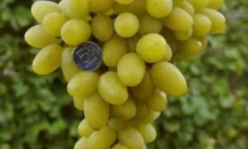 Визуально сорт привлекает внимание размером и формой плодов. Ягоды удлиненно-яйцевидные, очень крупные, их средний вес составляет 11,2 грамма. Окраска меняется по мере созревания: от матово-белой до приятной желтой при полном наборе сахара. Грозди также впечатляют размерами, их средняя масса около 612 граммов, а структура варьируется от плотной до средней плотности.
