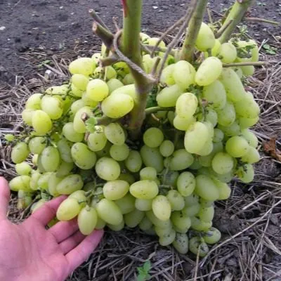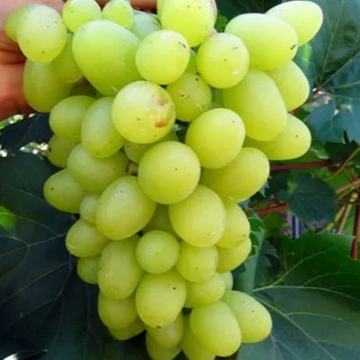 Визуально сорт привлекает внимание размером и формой плодов. Ягоды удлиненно-яйцевидные, очень крупные, их средний вес составляет 11,2 грамма. Окраска меняется по мере созревания: от матово-белой до приятной желтой при полном наборе сахара. Грозди также впечатляют размерами, их средняя масса около 612 граммов, а структура варьируется от плотной до средней плотности.