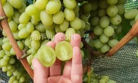 Кожица средней толщины и плотности, при употреблении в свежем виде практически не ощущается, но обеспечивает хорошую защиту мякоти и contributes to транспортабельности. Мякоть плотная, мясисто-сочная, с приятным хрустом. Сорт является бессемянным (кишмишным).