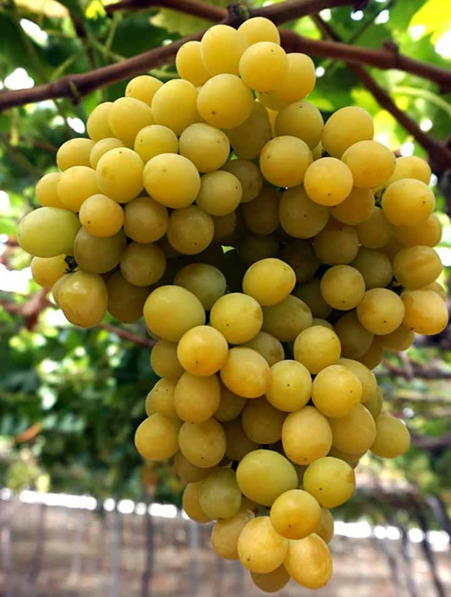 Грозди у этого винограда крупные, массой от 740 до 1200 граммов, средней плотности. Ягоды овальной формы, весом 5-8 граммов, что является отличным показателем для бессемянного (кишмишного) сорта. Окраска варьируется от светло-желтой до насыщенной янтарной по мере накопления сахаров.