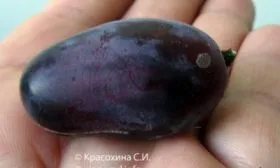 Ягоды привлекают внимание прежде всего нестандартной сосковидной формой — удлиненно-овальной с характерным заостренным кончиком. Их размер и вес (12-18 г) относятся к категории очень крупных. Окрас в технической спелости сиреневый, а при полном вызревании на солнечном месте может приобретать более глубокие фиолетовые переливы.