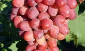 Эстетическая привлекательность – одна из сильных сторон этого гибрида. Грозди конической формы, средней плотности или рыхлые, имеют внушительный вид при массе 600-800 граммов. Ягоды овально-цилиндрической формы, очень крупные (10-12 граммов), при полном созревании приобретают насыщенный темно-розовый цвет с рубиновым оттенком на солнечной стороне.