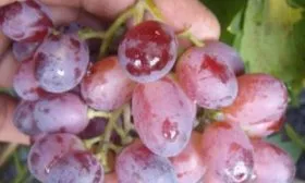 Ягоды однородные, крупные, овально-удлиненной формы. Их средний вес составляет 8-10 граммов, что является значительным показателем для бессемянного (кишмишного) сорта. Окраска — одна из самых привлекательных черт. Основной цвет розово-красный, но он неоднороден: на ягодах наблюдается красивый переливчатый градиент от нежно-розового в затененных участках грозди до насыщенного, теплого красного на солнцепеке.