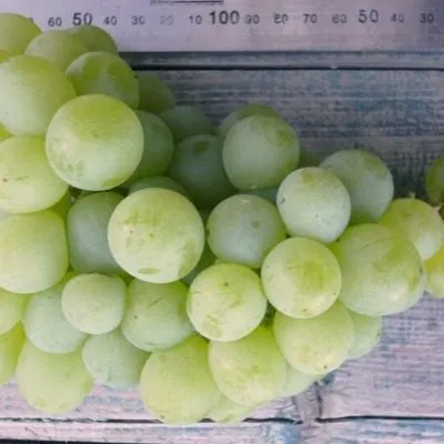 Поверхность покрыта густым слоем воскового налета (пруина), который хорошо виден невооруженным глазом. Этот природный барьер защищает ягоду от механических повреждений и частично от испарения влаги. Мякоть белая, сочная, без выраженной ароматики. Вкусовой профиль простой, сбалансированный, кисло-сладкий, что типично для многих технических сортов.
