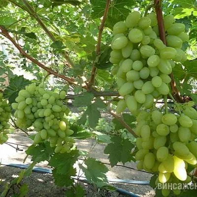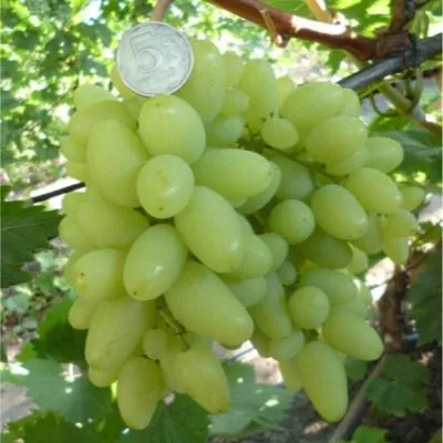Урожайность заявлена как высокая, что подтверждается солидными параметрами грозди и ягоды. Средний вес кисти от 600 до 800 граммов, а отдельные ягоды достигают 10-12 граммов, что является выдающимся показателем для белого винограда. Форма плодов удлиненно-овальная с характерным заостренным кончиком, что служит одним из визуальных признаков сорта.