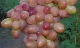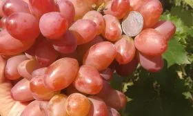 Ягоды массой 10–12 граммов, яйцевидной формы и розового цвета, выглядят очень эффектно. Тонкая, но при этом плотная кожица не ощущается при еде и хорошо защищает мякоть при перевозке. Мякоть мясисто-сочная, гармоничного вкуса с устойчивым мускатным тоном, который не исчезает даже в неблагоприятные по погоде годы. Именно это стабильное проявление муската, унаследованное от «Кишмиша лучистого», высоко ценится садоводами.