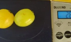 Ягоды округлой формы, выровненные по размеру, с массой от 8 до 16 граммов каждая. В состоянии полной зрелости они приобретают привлекательный желтый цвет. Кожица обладает выраженным глянцевым блеском, визуально создавая впечатление тонкой пленки, однако она достаточно плотная, чтобы обеспечивать хорошую лежкость и транспортабельность.