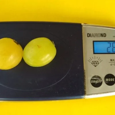Ягоды округлой формы, выровненные по размеру, с массой от 8 до 16 граммов каждая. В состоянии полной зрелости они приобретают привлекательный желтый цвет. Кожица обладает выраженным глянцевым блеском, визуально создавая впечатление тонкой пленки, однако она достаточно плотная, чтобы обеспечивать хорошую лежкость и транспортабельность.