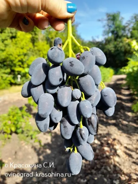 Ягоды выделяются своими размерами, их средний вес составляет 13-15 граммов, что является выдающимся показателем для столового винограда. Форма преимущественно овальная, иногда с легким сужением к кончику. Полностью созревшие плоды приобретают глубокий темно-фиолетовый окрас, который на солнце кажется почти черным. Поверхность покрыта плотным слоем пруина — натурального воскового налета, выполняющего защитную функцию.