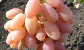 Сорт формирует крупные, очень презентабельные грозди средней плотности или рыхлые, вес которых варьируется от 800 граммов до 2,5 килограммов. Такая вариативность зависит от нагрузки куста и агротехники. Ягоды удлиненно-овальной формы, крупные (12-14 г), с интенсивной розовой окраской.