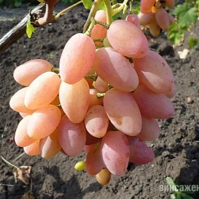 Сорт формирует крупные, очень презентабельные грозди средней плотности или рыхлые, вес которых варьируется от 800 граммов до 2,5 килограммов. Такая вариативность зависит от нагрузки куста и агротехники. Ягоды удлиненно-овальной формы, крупные (12-14 г), с интенсивной розовой окраской.