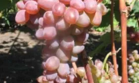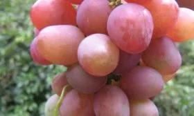 Ягоды привлекают внимание своей вытянутой, яйцевидной формой, которую часто называют «сосковидной». Их окраска — нежный розовый цвет, который на хорошо освещенных гроздях может приобретать более теплый, солнечный оттенок.