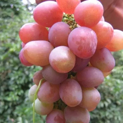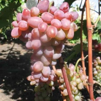 Ягоды привлекают внимание своей вытянутой, яйцевидной формой, которую часто называют «сосковидной». Их окраска — нежный розовый цвет, который на хорошо освещенных гроздях может приобретать более теплый, солнечный оттенок.