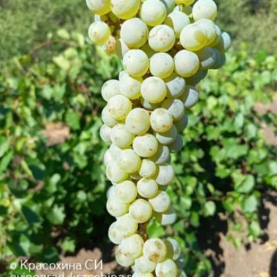 Ягоды имеют правильную округлую форму и белый цвет. По мере накопления сахара (до 200 г/дм³) на солнечной стороне может проявляться лёгкий золотистый «загар», что является визуальным индикатором созревания. Тонкая кожица, указанная в характеристиках, является ключевым технологическим преимуществом для виноделия, так как способствует лучшей экстракции сока и ароматических веществ во время брожения.