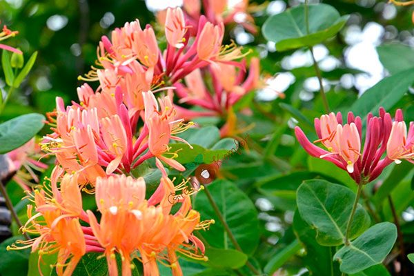 Растение изящно переплетается вокруг опоры и обладает привлекательным видом во время цветения. Это лиана с пурпурно-оранжевыми цветками. Жимолость часто используют как живую изгородь, солитёр или для создания акцентных участков в саду.