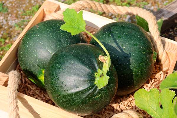 Плоды у этого сорта необычные для культуры — они практически круглые, поэтому их можно использовать как посуду для приготовления разных блюд. Цвет плодов — тёмно-зелёный, с мелкими точками. Кожура тонкая и нежная, слаборебристая.
