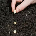 Лунки под семечки стоит делать на расстоянии 0,7-1 м, чтобы растение с длинными плетями могло свободно развиваться. Сухие проросшие семена нужно высаживать по 2-3 штуки в увлажненные лунки на глубину 2-6 см, а после присыпать землей. На легких грунтах (песках, суглинках) глубину посадки можно увеличить, а на тяжелых почвах (глине, черноземе) – уменьшить.