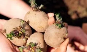 За месяц до высаживания в открытый грунт посадочный материал поместите в тёплое помещение. Для прорастания температура должна быть не ниже +12-16°С. Картофелины переворачивайте два раза в месяц.