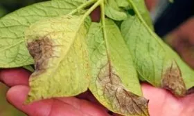 - Фитофтороз. Распространённая грибковая болезнь, поражающая все части. На листьях появляются тёмно-коричневые пятна, которые могут перейти на клубни. Для лечения и профилактики используйте медный купорос, бордоскую жидкость, препараты Ридомил, Агат, Ширпан.