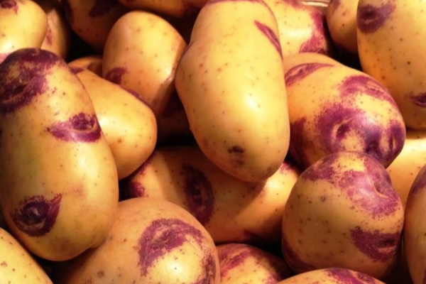 - Клубни имеют овальную форму и жёлтую окраску с фиолетовыми пятнами вокруг глазков.
