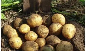 - Уборку проводят в сухую погоду. Вилы или лопату заглубляют сбоку от куста, приподнимая пласт земли. Клубни с гладкой светло-бежевой кожурой и очень мелкими глазками легко извлекаются из почвы.