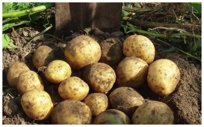 - Уборку проводят в сухую погоду. Вилы или лопату заглубляют сбоку от куста, приподнимая пласт земли. Клубни с гладкой светло-бежевой кожурой и очень мелкими глазками легко извлекаются из почвы.