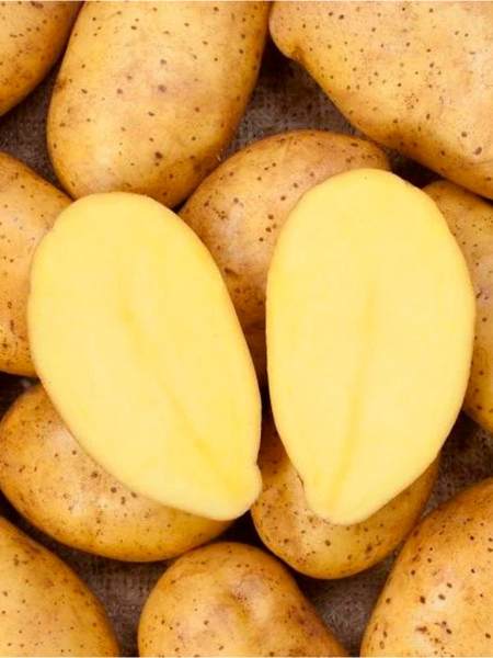 На срезе клубня видна мякоть желтой окраски. Такой цвет обусловлен наличием каротиноидов — природных пигментов, которые являются предшественниками витамина А и обладают антиоксидантными свойствами. Для потребителя это не только потенциальная польза, но и визуально привлекательный вид готовых блюд.