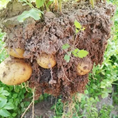 Ключевая особенность, напрямую влияющая на удобство уборки, — компактное расположение клубней. Растение формирует аккуратное, хорошо сгруппированное гнездо. Клубни завязываются близко к центру куста и не «разбегаются» в стороны, что минимизирует потери при копке и позволяет легко найти все картофелины.