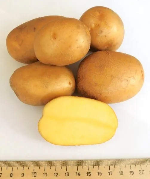 Размер картофелин средний, масса обычно колеблется в пределах 90-130 граммов. В гнезде, как правило, формируется 8-12 однородных клубней без выраженной склонности к мельчанию.