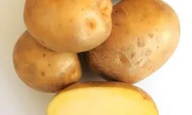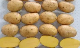 - Переберите клубни за 3-4 недели до планируемой посадки. Отложите для проращивания здоровые, типичной для сорта формы, массой 50-80 граммов. Крупные клубни можно разрезать вдоль, но обязательно так, чтобы на каждой части осталось 2-3 развитых глазка. Срез нужно подсушить и опудрить древесной золой.