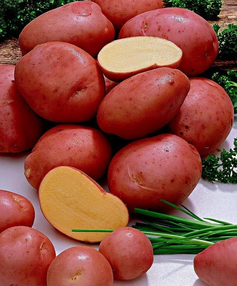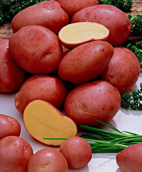 Клубни имеют очень характерный, запоминающийся вид. Их форма овальная, выровненная, что не только удобно для укладки в тару и хранения, но и снижает механические повреждения при машинной уборке. Поверхность покрыта гладкой кожурой насыщенного красного цвета, которая легко отмывается от почвы.