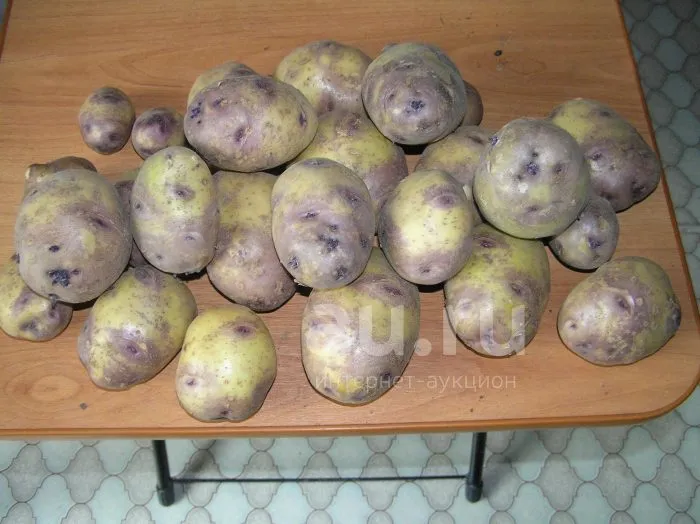 Форма, размер и другие параметры. Клубни в основном имеют овально-округлую, выровненную форму. Согласно характеристикам, сорт формирует крупные клубни, что на практике означает преобладание в гнезде экземпляров массой, значительно превышающей стандартные размеры. Глазки залегают неглубоко, что упрощает очистку. Количество клубней под одним кустом, как правило, составляет 12-15 штук, что при их крупном размере обеспечивает высокую общую урожайность.