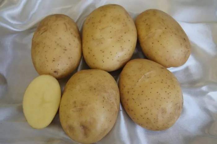 Внешний вид и структура клубней — визитная карточка этого сорта. Они имеют аккуратную, выровненную удлиненно-овальную форму, что делает их удобными для механической уборки и последующей обработки. Кожура гладкая, желтого цвета, что облегчает мойку и чистку.