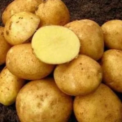 Сорт формирует клубни овальной формы с желтой кожурой и желтой мякотью. Средняя масса товарного клубня составляет 108-146 граммов, что указывает на выровненность и крупный размер. Содержание крахмала находится в диапазоне 14,0-14,8%, что классифицируется как средний уровень. Такое количество крахмала обеспечивает хороший вкус, универсальность в кулинарии (клубни хорошо развариваются, но не превращаются в пюре при варке целиком) и делает сорт пригодным для большинства видов переработки.