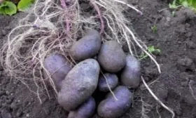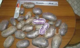 Клубни отличаются выровненностью, их средняя масса составляет 100–150 граммов. Они обладают выраженными сортовыми признаками: толстая кожура имеет насыщенную темно-пурпурную окраску, а мякоть — светло-фиолетовую. Интенсивность окраски мякоти может быть неоднородной: часто наблюдаются более светлые участки в центральной части и в периферийном слое под кожурой.