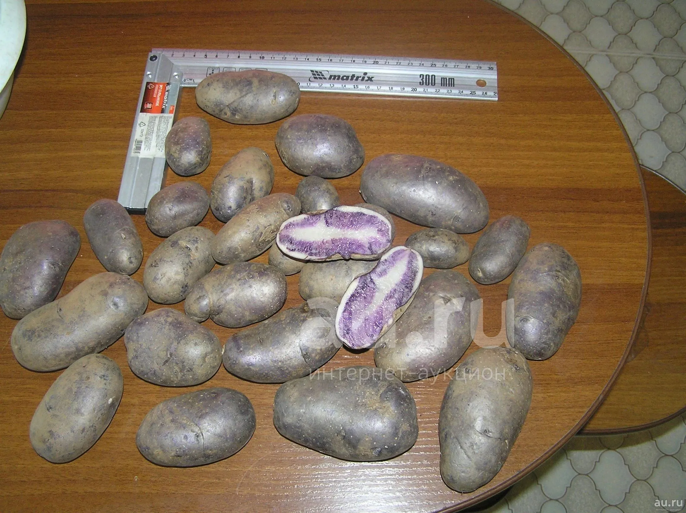 Клубни отличаются выровненностью, их средняя масса составляет 100–150 граммов. Они обладают выраженными сортовыми признаками: толстая кожура имеет насыщенную темно-пурпурную окраску, а мякоть — светло-фиолетовую. Интенсивность окраски мякоти может быть неоднородной: часто наблюдаются более светлые участки в центральной части и в периферийном слое под кожурой.