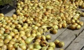 Далее перо обрезают, оставляя шейку длиной 3–5 см. Обрезанные луковицы необходимо досушить в проветриваемом помещении (на чердаке, в беседке, под навесом) еще 2–3 недели. За этот период внешние чешуи окончательно подсохнут и приобретут характерный для сорта темно-желтый с коричневатым оттенком цвет, а шейка станет тонкой и закрытой.