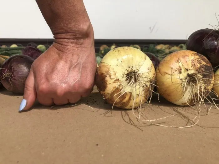 - Первичная полевая просушка. Выкопанный лук раскладывают прямо на грядке в один слой на 7-10 дней, если стоит сухая погода. Это позволяет солнцу и ветру просушить наружные чешуи и обеззаразить их. На ночь или при угрозе дождя урожай необходимо укрывать пленкой или переносить под навес.