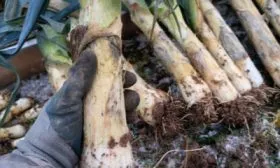 Растения аккуратно подкапывают вилами, стараясь не порезать ложный стебель (ножку). После выкопки землю осторожно отряхивают, избегая механических повреждений, которые становятся очагами гниения. Для закладки на длительное хранение отбирают экземпляры с крепкой, неповрежденной ножкой и здоровыми листьями.