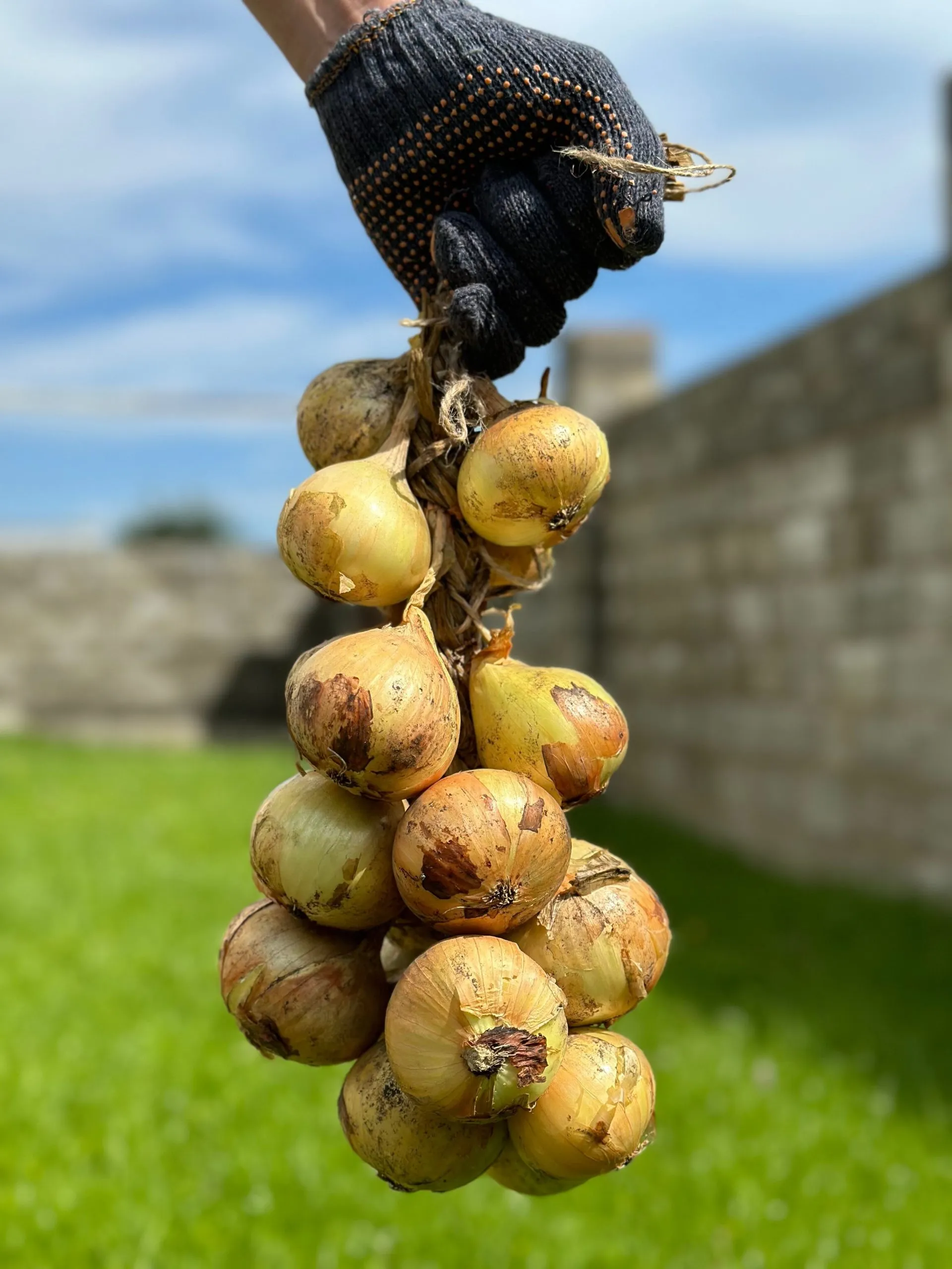 - Качественную просушку. Разложите урожай в один слой прямо на грядке (в солнечную погоду) или под навесом, на чердаке, в сарае с хорошим сквозняком. Процесс занимает 10-15 дней. Готовность определяется по тонкой, жесткой шейке и характерным для сорта темно-желтым покровным чешуям.