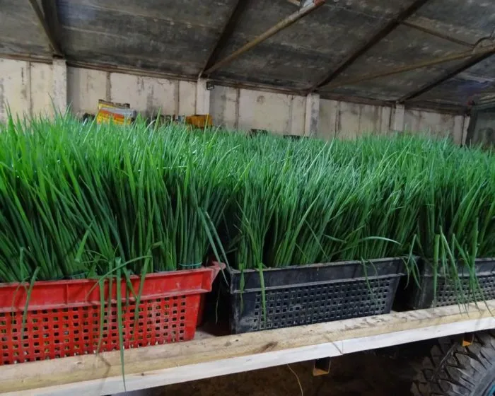 Перо полое внутри, но при этом отличается значительной толщиной и сочностью. Длина листьев в фазу технической спелости, оптимальной для первой срезки, достигает 35-45 см. Ложный стебель (белая, неокрашенная часть у основания) длинный, крепкий и имеет чистый белый цвет, который резко контрастирует с темной зеленью, плавно переходя в нее.