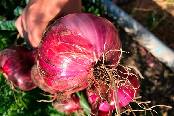 У луковицы округло-плоская форма, а вес достигает до 200 г. Сухие чешуйки окрашены в тёмно-бордовый оттенок, а сочные – от розового до светло-сиреневого цвета.