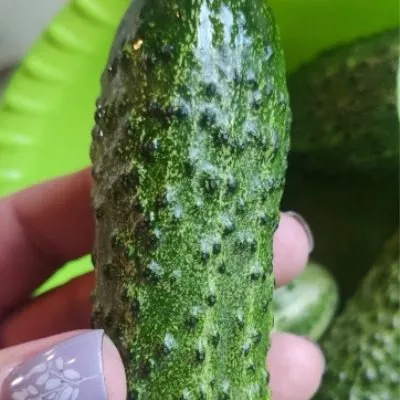 Окраска насыщенно-зеленая с короткими светлыми полосами, доходящими примерно до трети плода. Поверхность покрыта частыми мелкими бугорками. Такая кожица обеспечивает приятную текстуру и хорошо пропускает рассол или маринад при засолке.