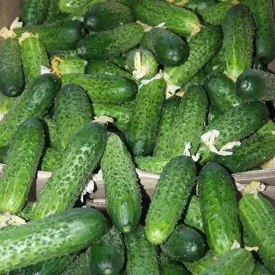 Плоды короткие, длиной 9,2-9,4 см, массой 95-100 граммов, имеют классическую цилиндрическую форму. Окраска темно-зеленая со светлыми, короткими полосами, доходящими примерно до трети длины огурца. Поверхность среднебугорчатая.