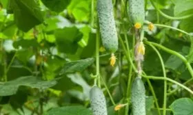 - В средней части стебля (примерно до высоты 1,5-1,7 м) боковые побеги (пасынки) не удаляют полностью, а прищипывают после первого листа и первой завязи. Таким образом, пасынок превращается в плодовую веточку с одним пучком огурцов и не оттягивает на себя много сил.